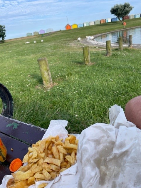 Lots of tedium hanging around waiting to board the ferry, which has just left Harwich to venture out into the North Sea. Leaving at that time meant it was too late for me to eat dinner on the ship, so it’s been a Fish + Chip supper on the beach this evening!!!