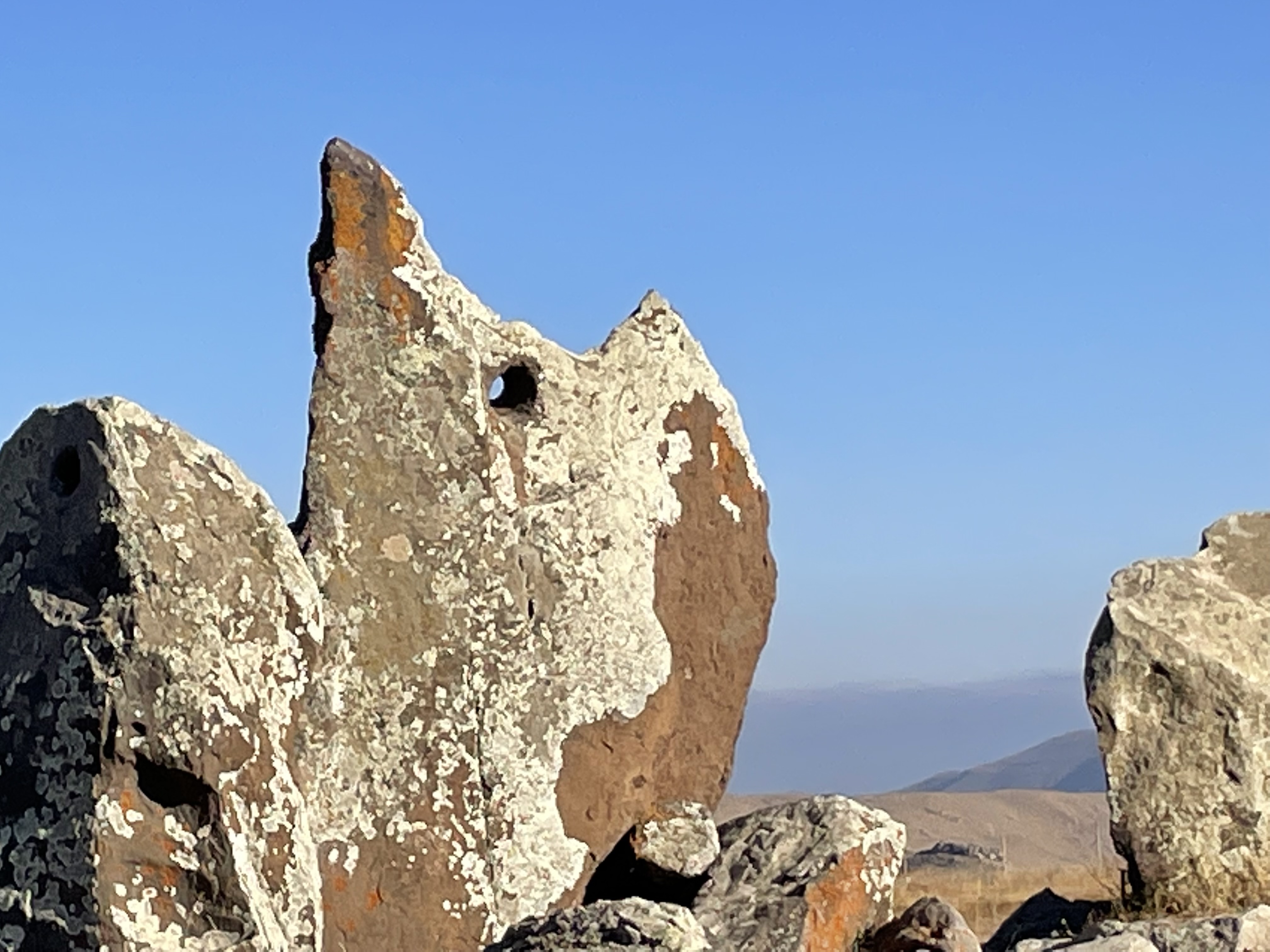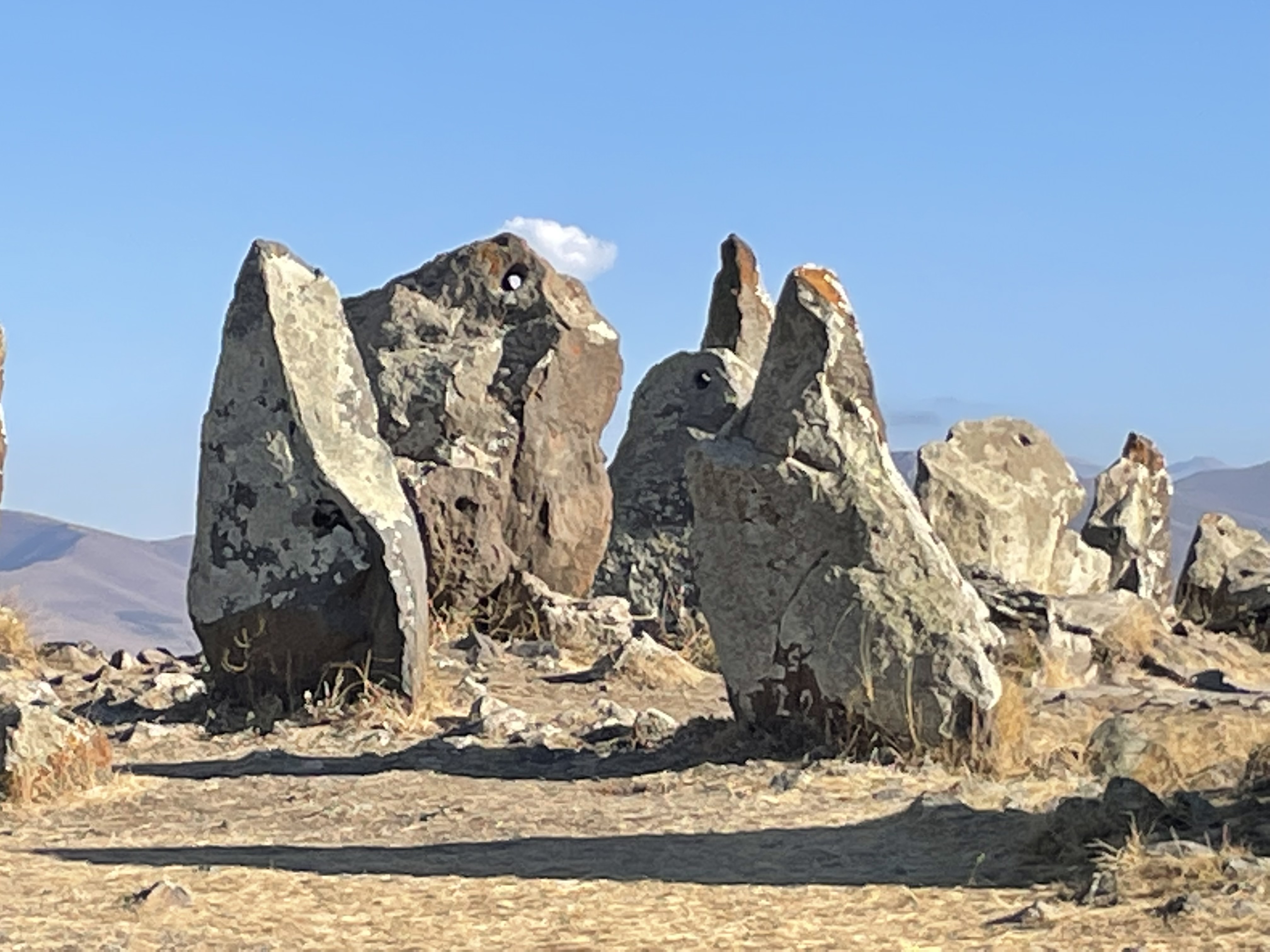 The Armenians estimate that their Stonehenges is 3,500 years older than the one in Wiltshire. The site was officially renamed Karahunj Observatory in 2004 when Armenian academics found that it was likely once an observatory. That conclusion was based on detailed analysis of the meaning of the holes in 80 of the 223 stones on the site. The academics reckoned that seventeen of the stones were used to observe the sunrise and sunset at the solstices and equinoxes and 14 of them were associated with 7500-year-old lunar observations.