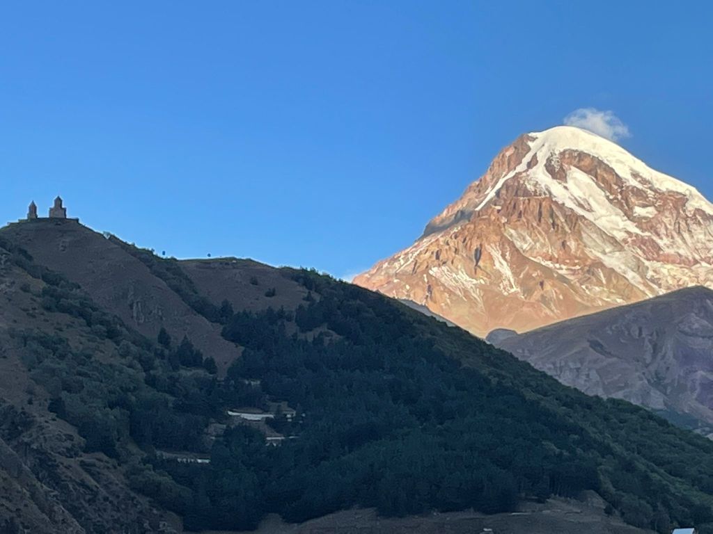 That’s Mt. Kazbek,15,851 feet high shining in the early morning sun. To the left on the skyline is the 14th century Gergeti Trinity church at just 7,119 feet which we hiked up to yesterday afternoon when we arrived in Kazbegi.