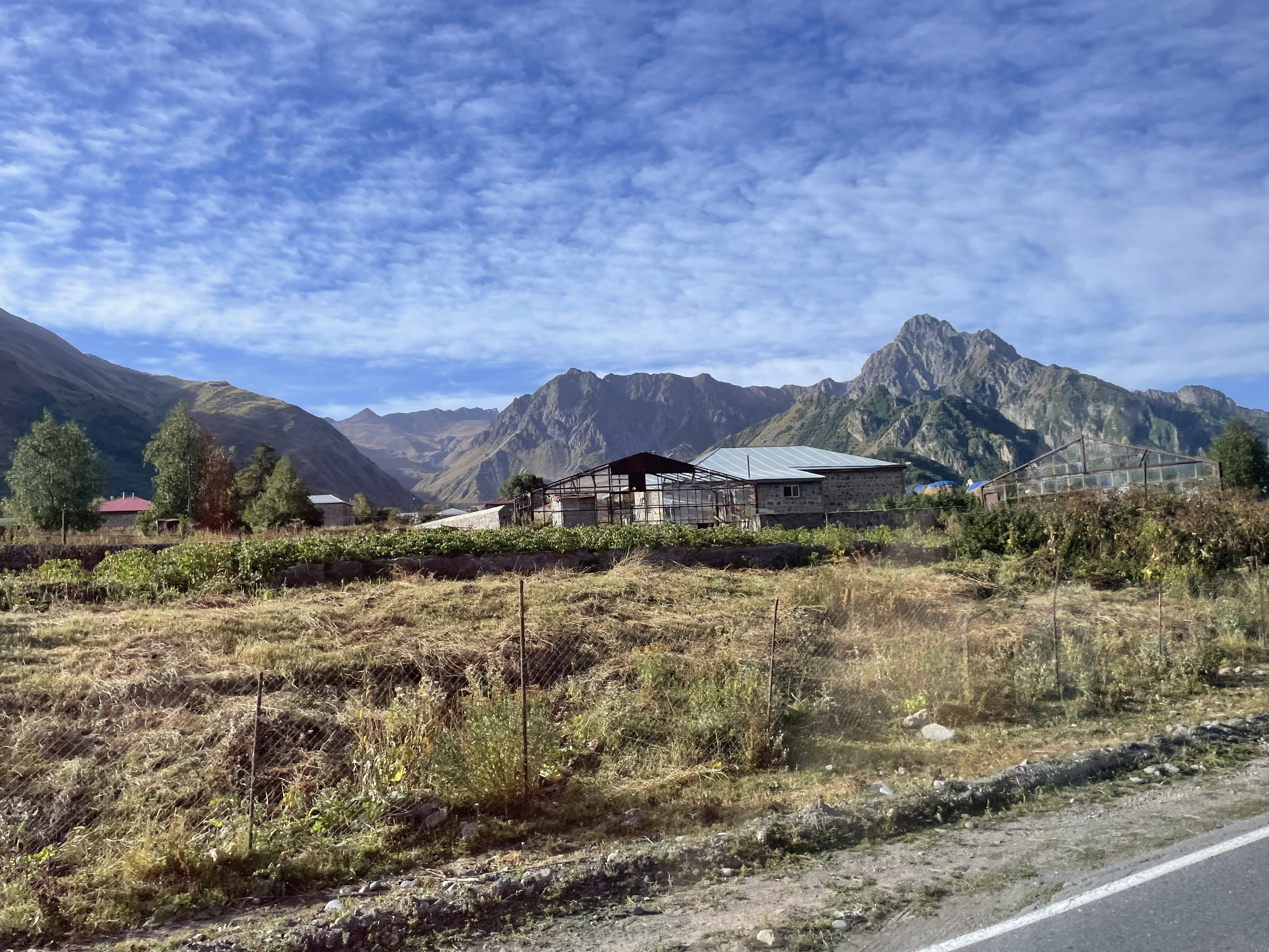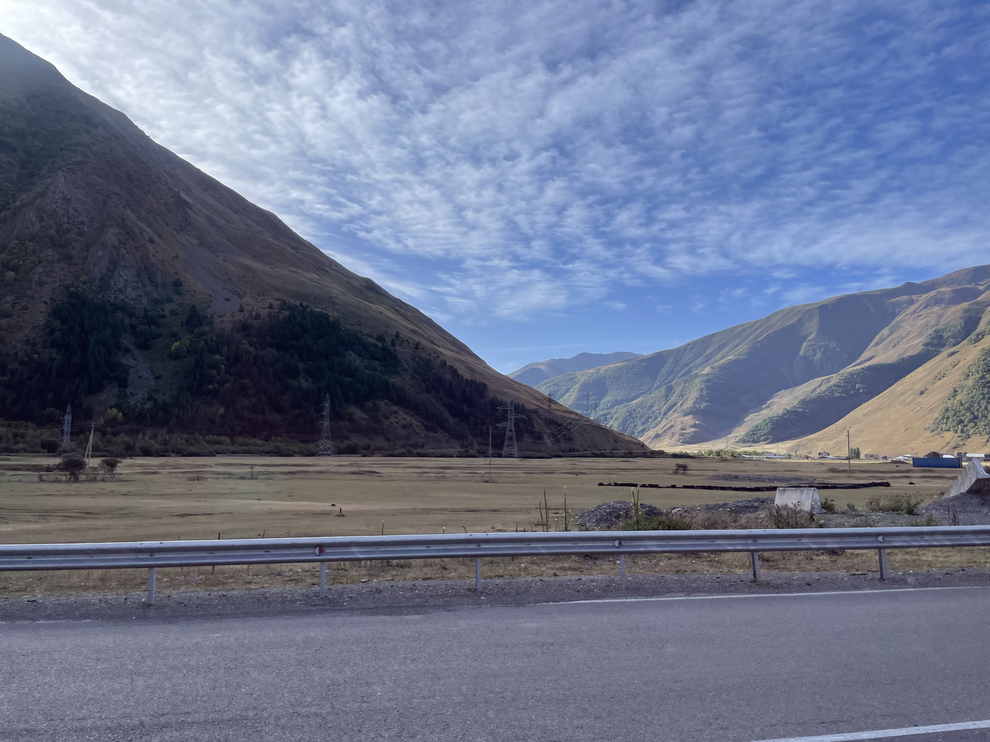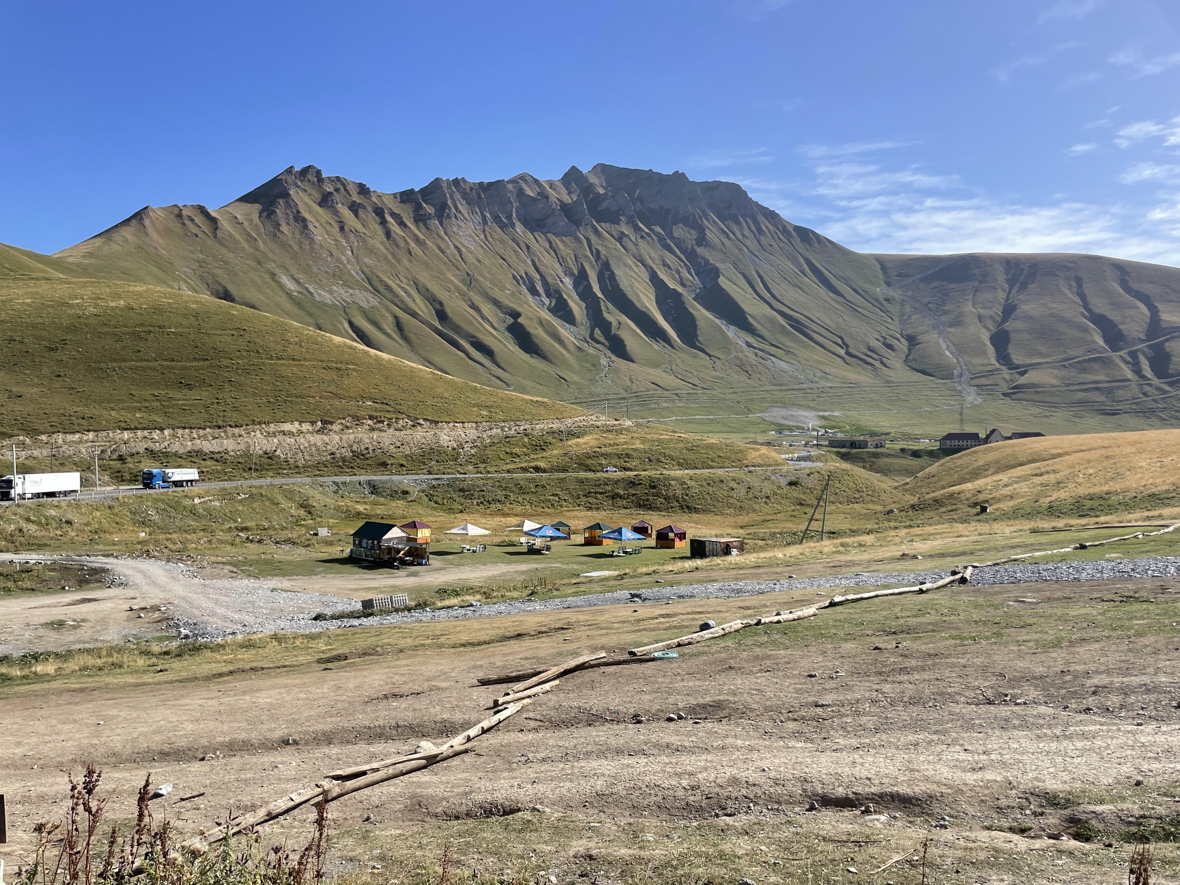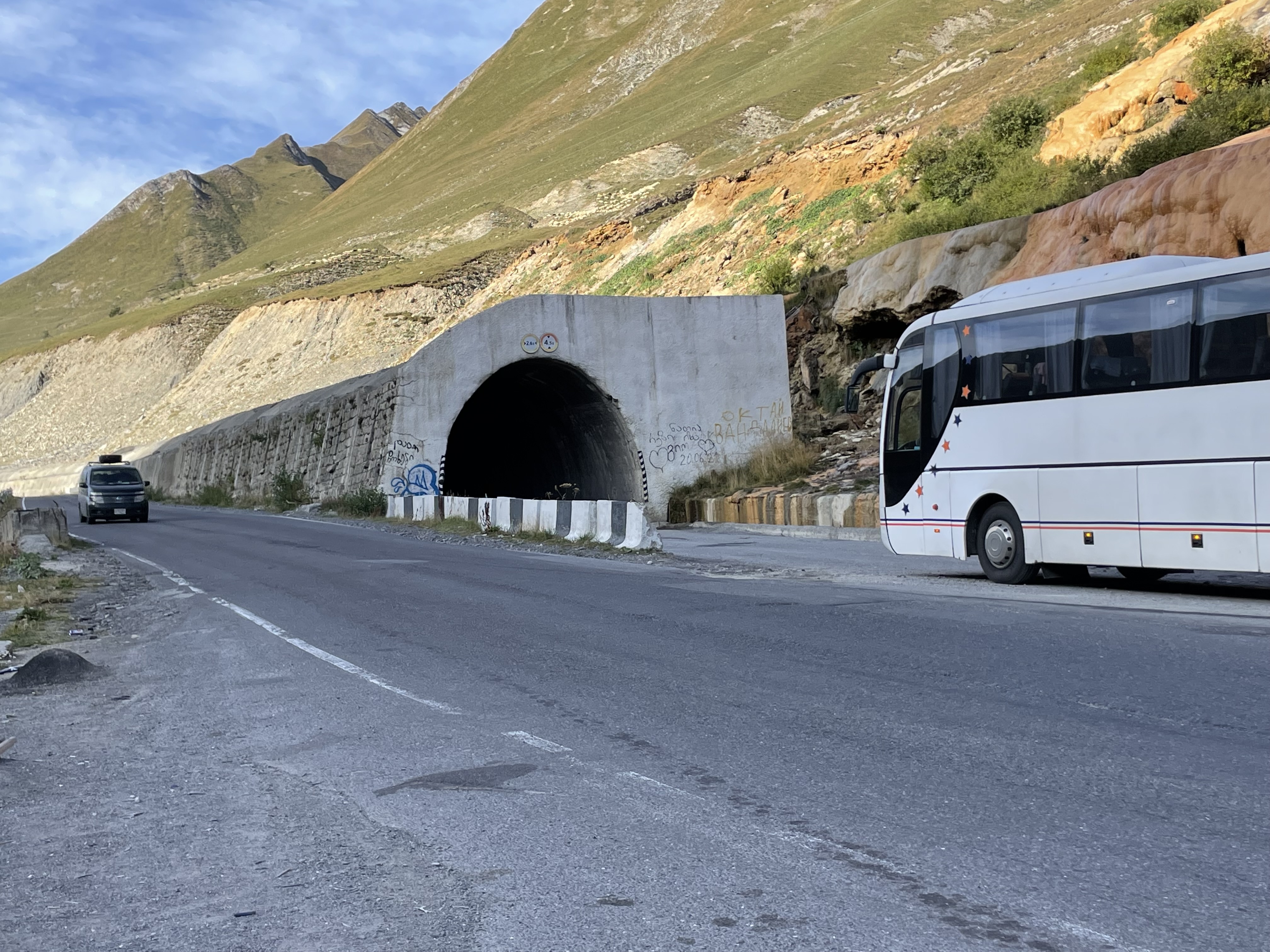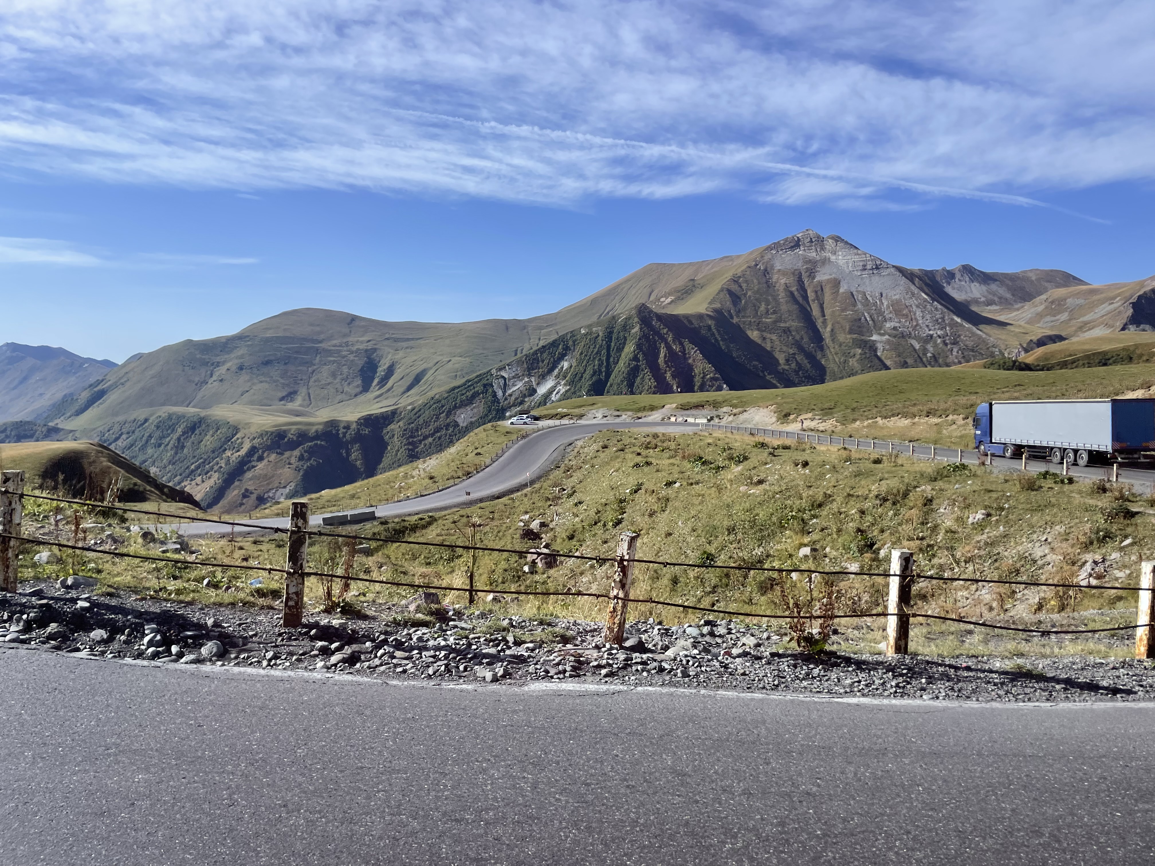 Given the Georgian Military Highway is the only crossing that the Russians are permitting for trucks moving between Georgia and Russia, it’s important that they keep it open as much as possible during the harsh Caucasian winters. This is a shot of one of several ‘snow tunnels’ we saw which are constructed where the road is especially vulnerable to snow avalanches: they look pretty inadequate to me – my guess is they are not big enough to carry two way traffic and so must be operated as some kind of one-way system. There was also a remarkable looking rock formation right next door to this tunnel. Although the road Highway has a grand title and is clearly of major strategic importance, it is far from being what the Brits call a Motorway, as you can see from the final pic: