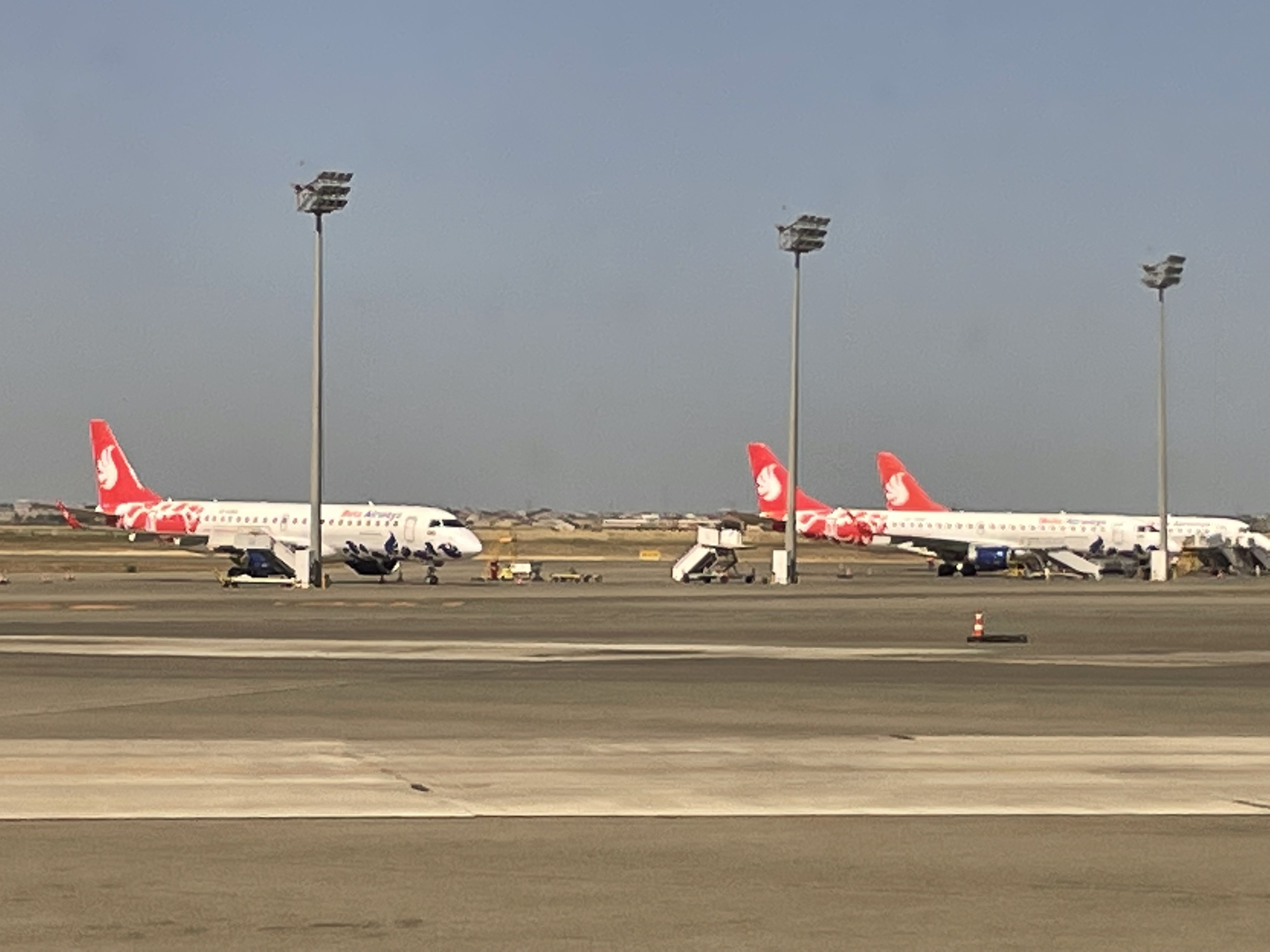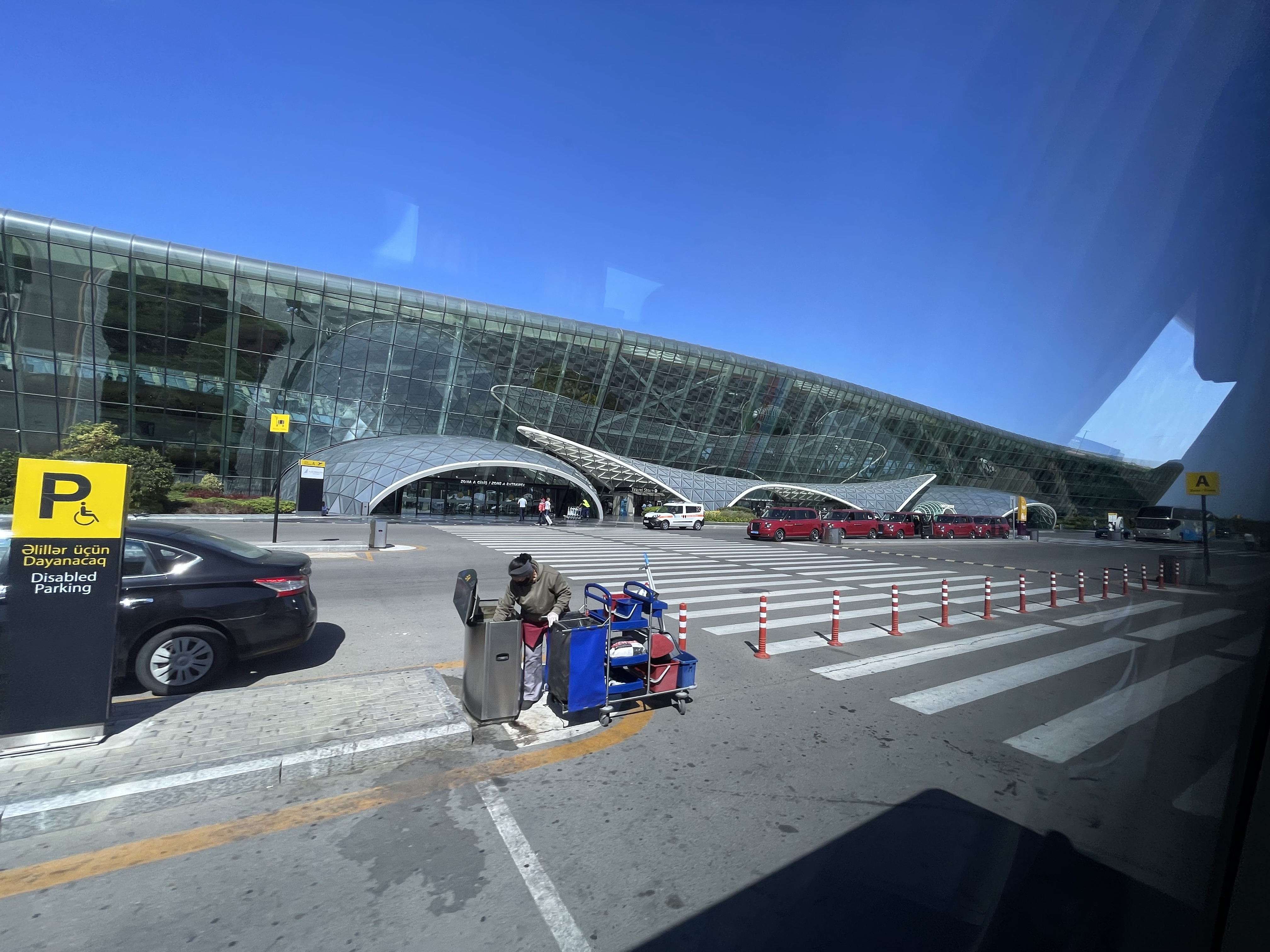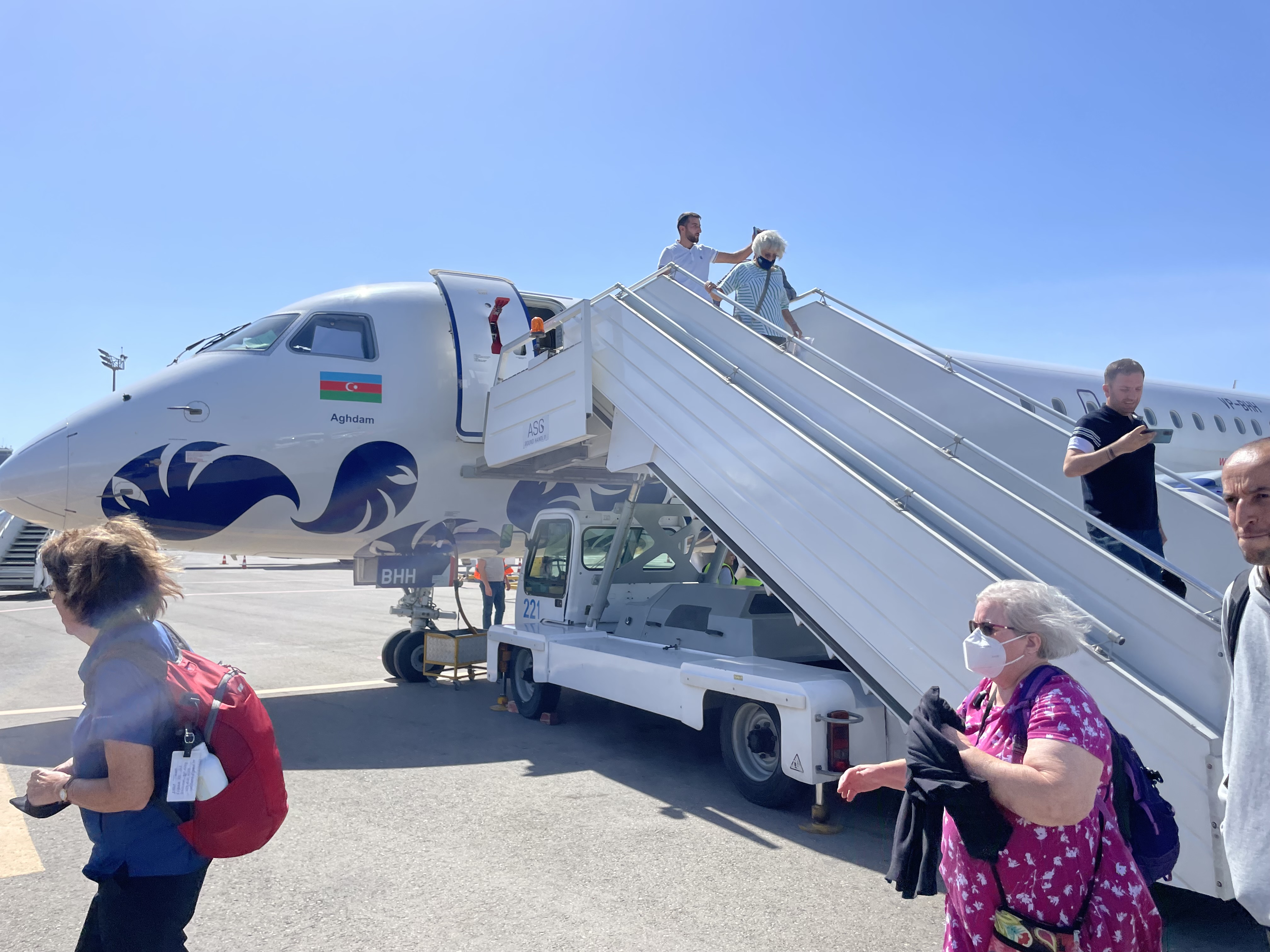 Tbilisi airport was pretty civilized and the whole flight went off without drama: here are Lydia, Patti and Dario getting off the plane at Baku and a shot of some Batu Airlines’ smart Airbus jets in case you want to be able to recognise them if you ever get to the Caucasus!!!