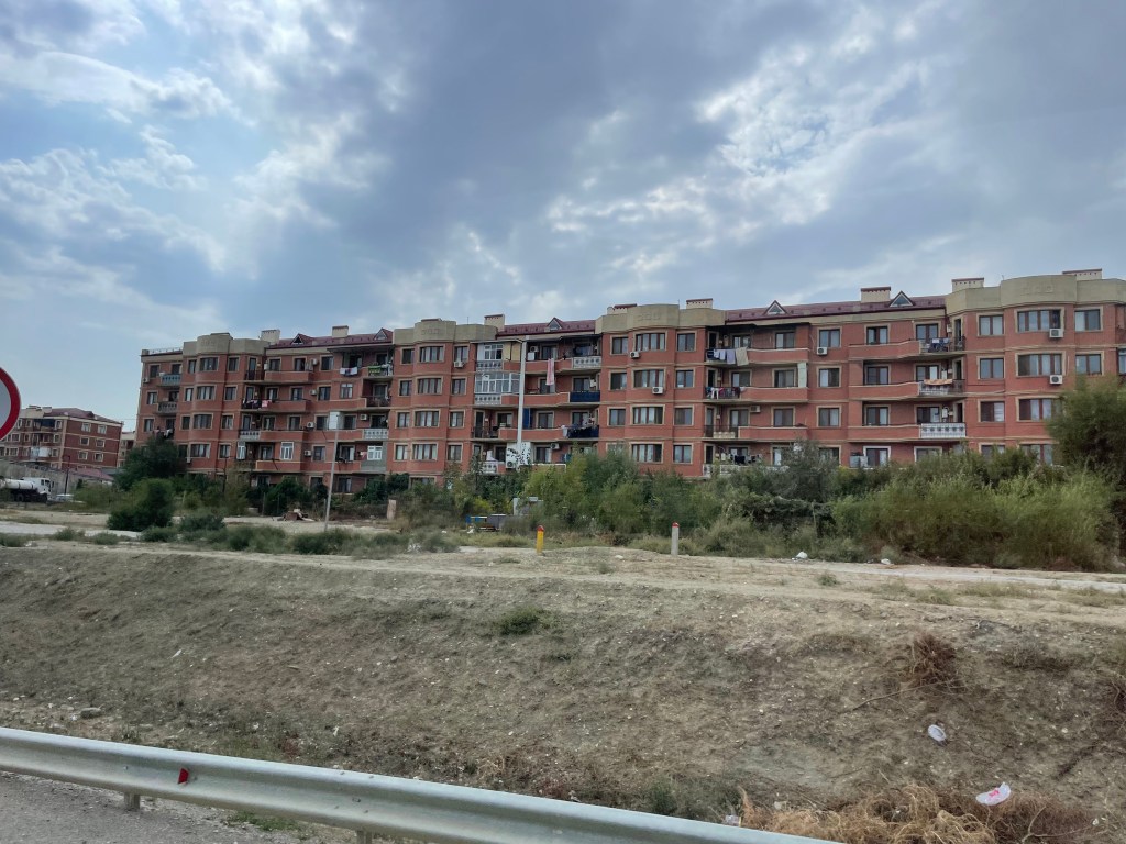 Not quite so impressive are these workers’ apartments on the outskirts on Baku: on the other hand they do look more congenial than the Soviet era apartment blocks we saw in Armenia and Georgia!