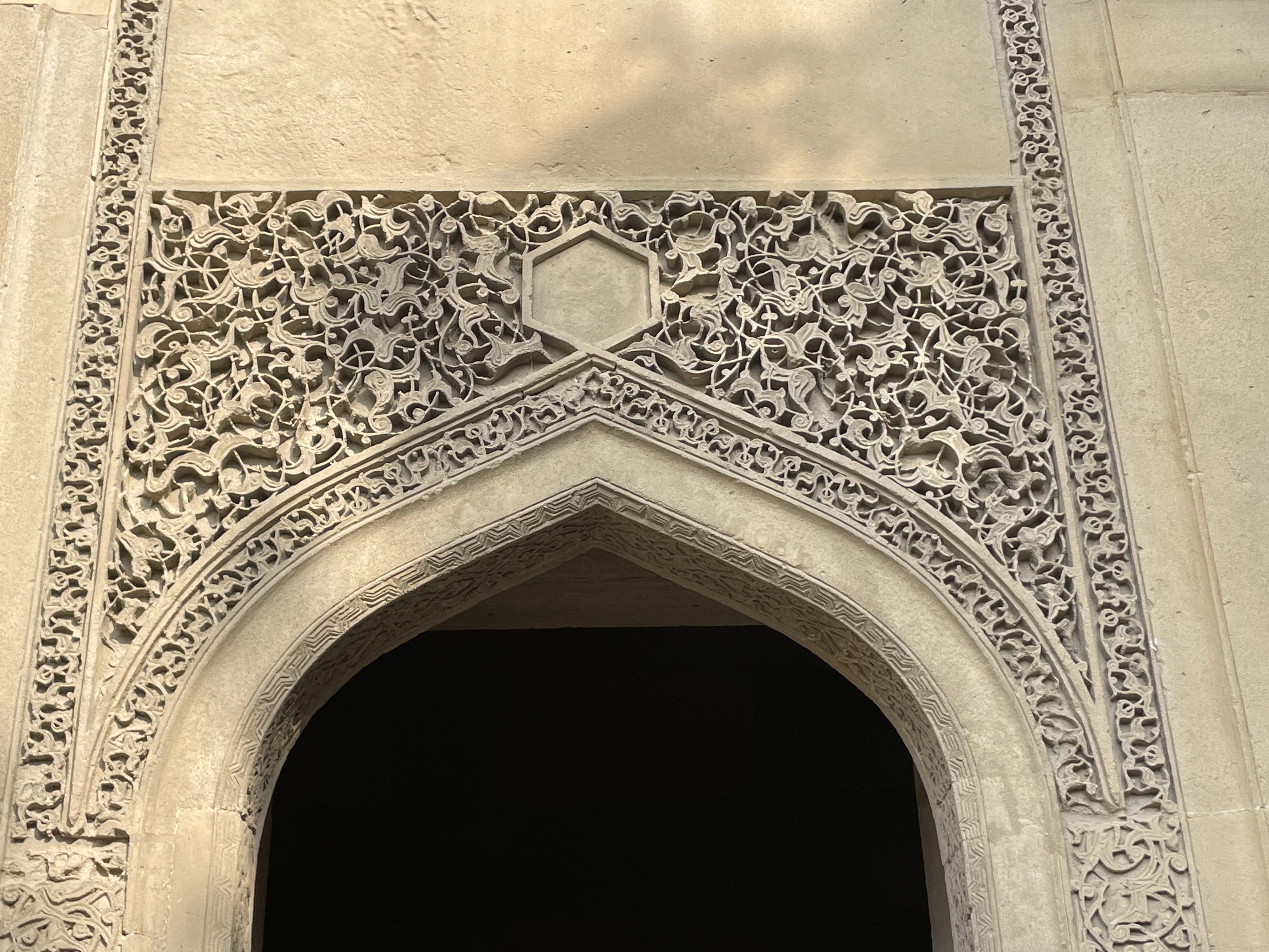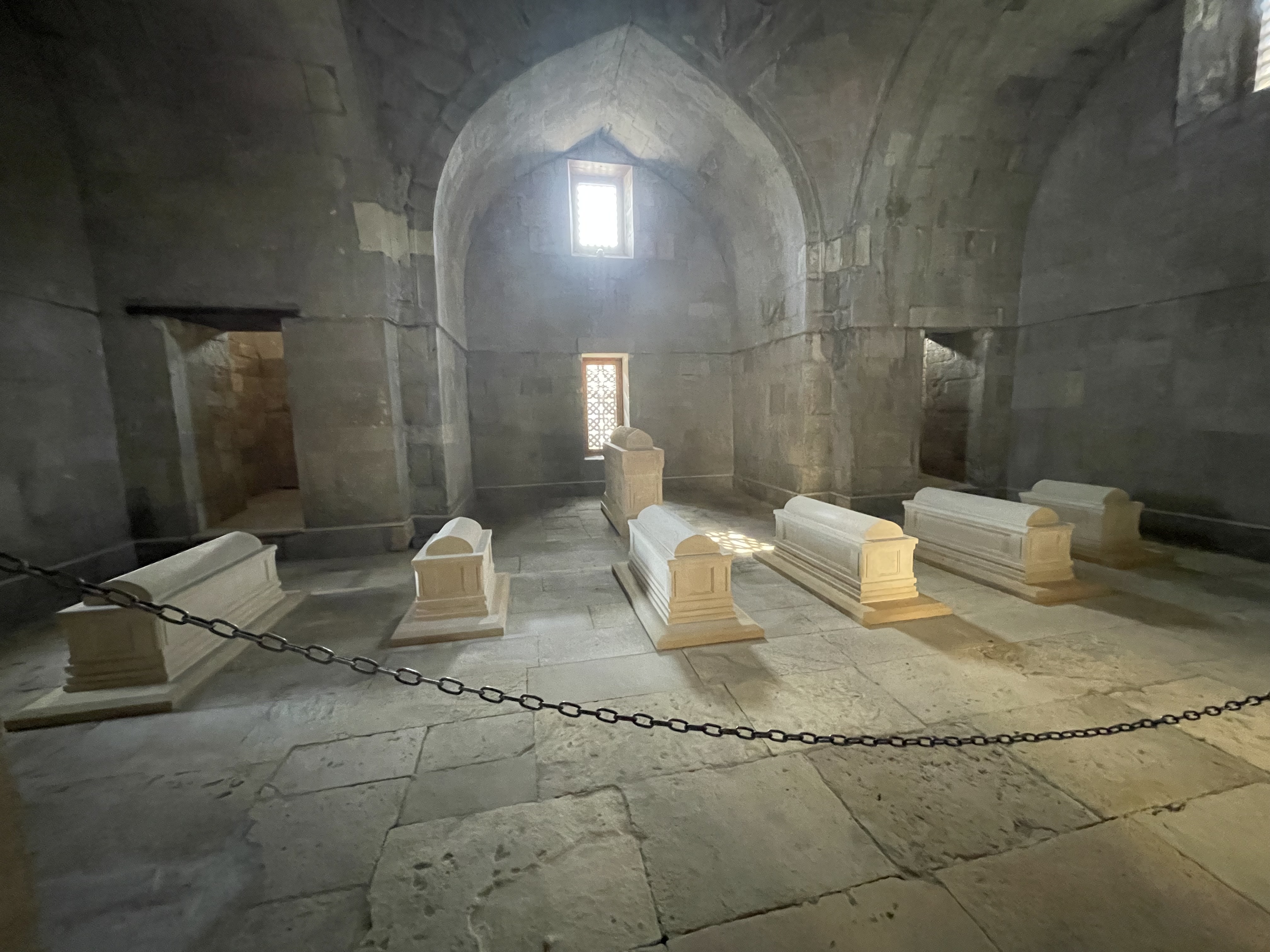 Yet another building is the Tomb of Shirvanshah’s family which is a mausoleum constructed in Baku in about 1457-1458 for the burial of the mother of Shirvanshah Kalilullah1 – Bike Khanim -and his 6 year old son Farrukh Yamin. As you can see there are some caskets within the mausoleum but these are generally thought to be empty: there is a rather poingnant small casket to the right of the others probably that of Shirvanshah Kalilullah1’s 6 year old son….