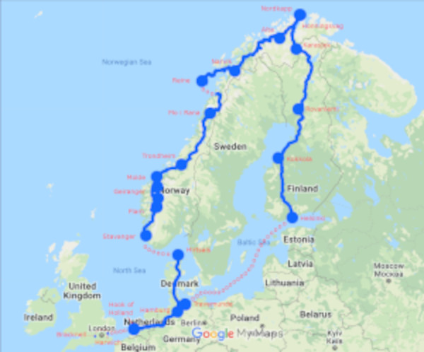 I’m excited!!! A great drive is in prospect through the mountains and fjords of Norway, including an 800 miles stretch on the Arctic Highway, one of the world’s great roads from Mo i Rana, just south of the Arctic Circle up to Honningsvag and the Nordkapp, just nineteen and half degrees south of the North Pole!