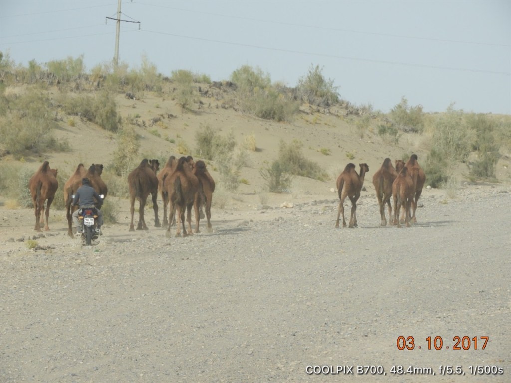 All this taking place in the lunar landscape of the Karakum Desert and much of it out in the sun. Getting the picture?? Turkmen guys only checked the passport four times, I think, but made us open all our luggage and rifled through it. Having been well briefed in advance I left all my dirty laundry at the top!